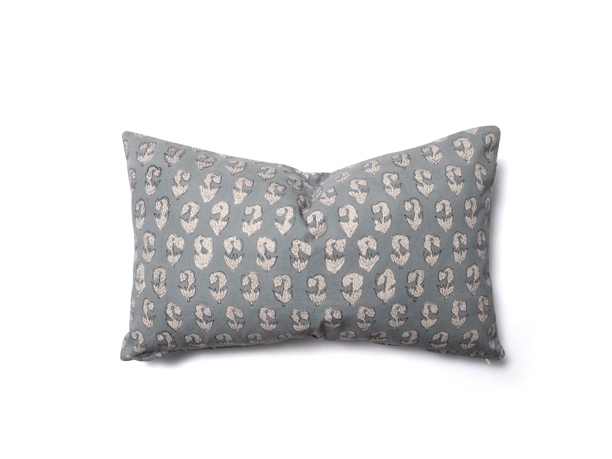 Blau Lumbar es una funda de cojín gris azulado con flores crudo por el frente y sólido color crudo por atrás. Estampado a mano en India con técnica de bloques de madera, sobre una tela de algodón grueso premium.